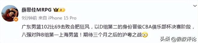 根据赛制的规则,广东男篮102比69击败合肥狂风,以D组第二的身份晋级CBA俱乐部杯决赛阶段,八强对阵B组第一上海男篮!期待三个月之后的沪粤之战。