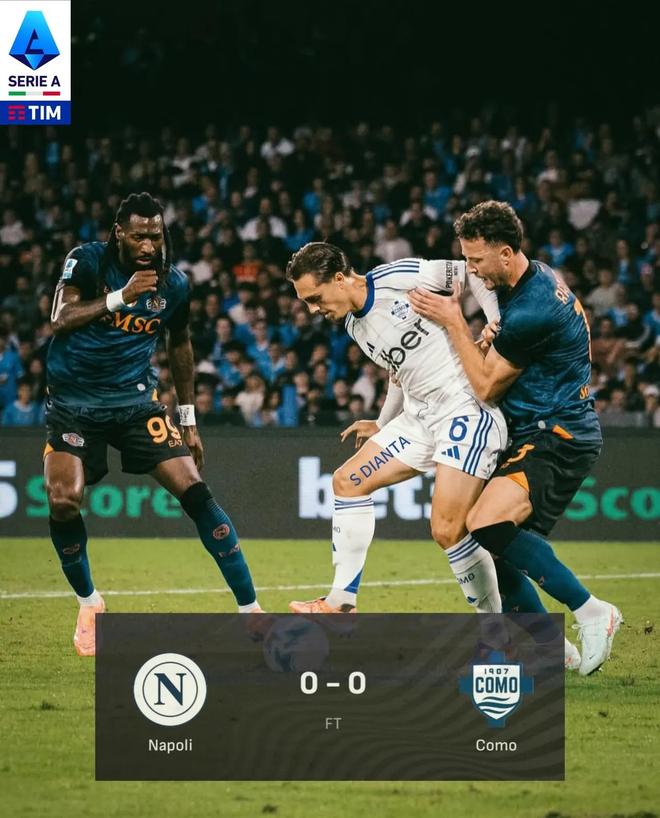那不勒斯主场0:0被科莫逼平,而且要不是莫拉塔点球罚丢,洪水连1分都捞不到!科莫这赛季黑马成色十足,目前与榜首只有5分之差,会是欧战资格的有力争夺者。