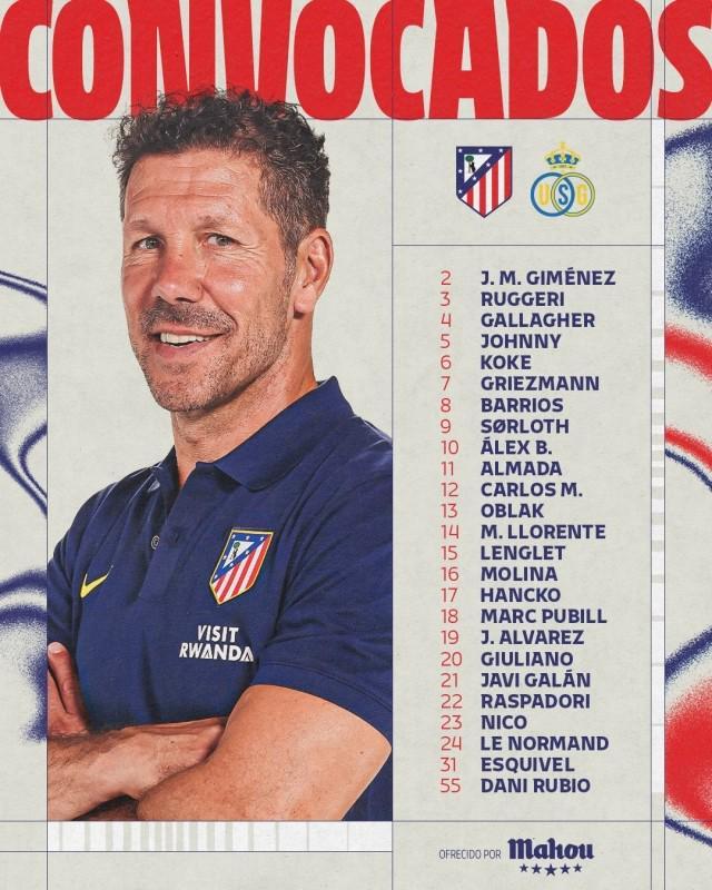 欧冠联赛阶段第4轮,马德里竞技主场迎战圣吉勒斯联。床单军团公布大名单,胡利安、格列兹曼领衔。 马竞大名单: 门将:奥布拉克、埃斯基韦尔、达尼·鲁维奥 后卫:何塞·希门尼斯、鲁杰里、略伦特、朗格莱、纳韦尔·莫利纳、汉茨科、普维尔、加兰、勒诺尔芒 中场:加拉格尔、约翰尼·卡多索、科克、巴勃罗·巴里奥斯 前锋:格列兹曼、瑟洛特、巴埃纳、阿尔马达、卡洛斯·马丁、胡利安·阿尔瓦雷斯、朱利亚诺·西蒙尼、拉斯帕多里、尼古拉斯·冈萨雷斯